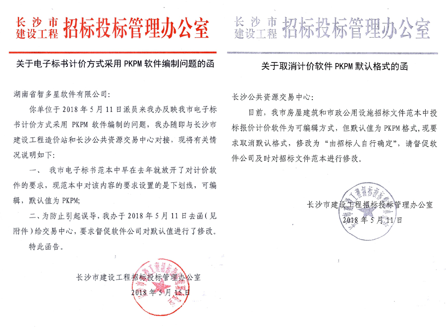 這種有悖公平、公正市場(chǎng)原則的做法,既損害了其他造價(jià)軟件公司的利益,更迫使建設(shè)工程造價(jià)從業(yè)單位增購(gòu)PKPM軟件,大幅增加了建設(shè)工程造價(jià)從業(yè)單位的負(fù)擔(dān),社會(huì)影響十分惡劣。湖南智多星軟件有限公司作為湖南省工程造價(jià)軟件唯一一家新三板掛牌企業(yè),我們有責(zé)任替廣大造價(jià)軟件用戶(hù)和企業(yè)說(shuō)話(huà),因而我們毅然決然對(duì)這種不公平的現(xiàn)象說(shuō)“不”!在2018年5月,我公司通過(guò)信函、上門(mén)的方式,積極向紀(jì)檢及相關(guān)職能部門(mén)進(jìn)行投訴反饋,通過(guò)多次溝通協(xié)商,2018年5月11日,長(zhǎng)沙市招標(biāo)辦正式發(fā)函,取消在長(zhǎng)沙市建設(shè)項(xiàng)目招投標(biāo)過(guò)程中默認(rèn)PKPM計(jì)價(jià)軟件,改為通用格式,并正式通知長(zhǎng)沙市公共資源交易中心,要求其在標(biāo)書(shū)模板上進(jìn)行修改(見(jiàn)附件)。我公司也于2018年5月17日收到長(zhǎng)沙市公共資源交易中心的正式通知,告知我司標(biāo)書(shū)模板已修改完成。在日后的建設(shè)工程造價(jià)工作中,若再次遇到指定使用PKPM軟件的情況,歡迎向我公司反饋,我們將全力配合調(diào)查取證,并積極向上級(jí)主管部門(mén)舉報(bào)。