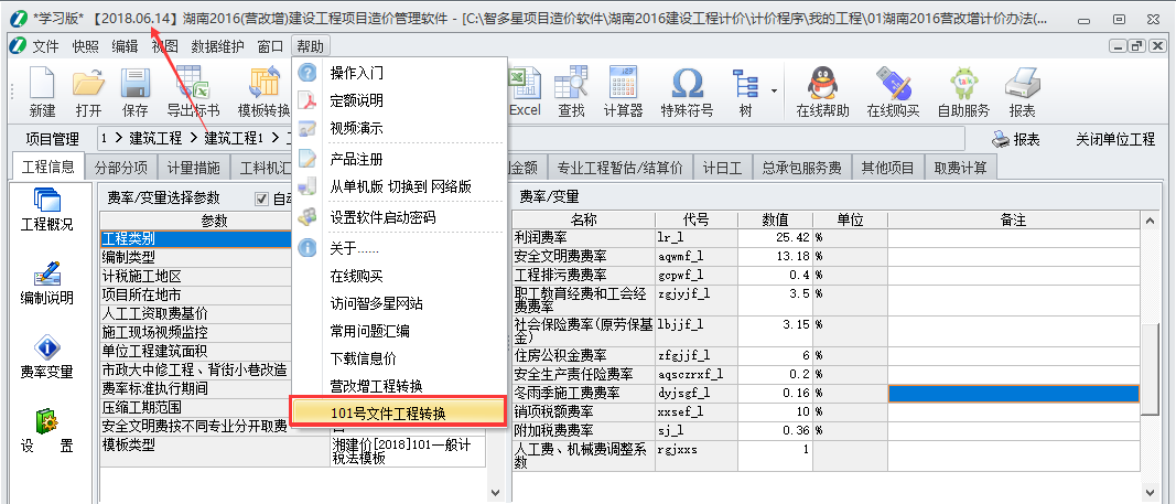 湖南2016計價程序已增加了最新101模板,并做了相應的轉換工具,可將160號文的工程一鍵轉換,分“轉換”與“刷新”兩部分,具體操作如下: