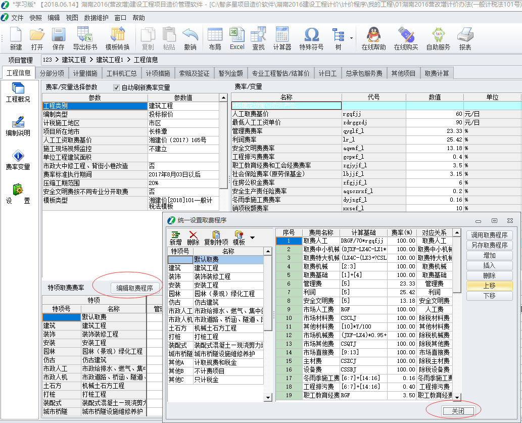 1. 在【工程信息】界面的“費率變量”窗口, 點“編輯取費程序” , 打開后關閉, 然后在彈出的對話框中根據提示點“是”,即可刷新取費;