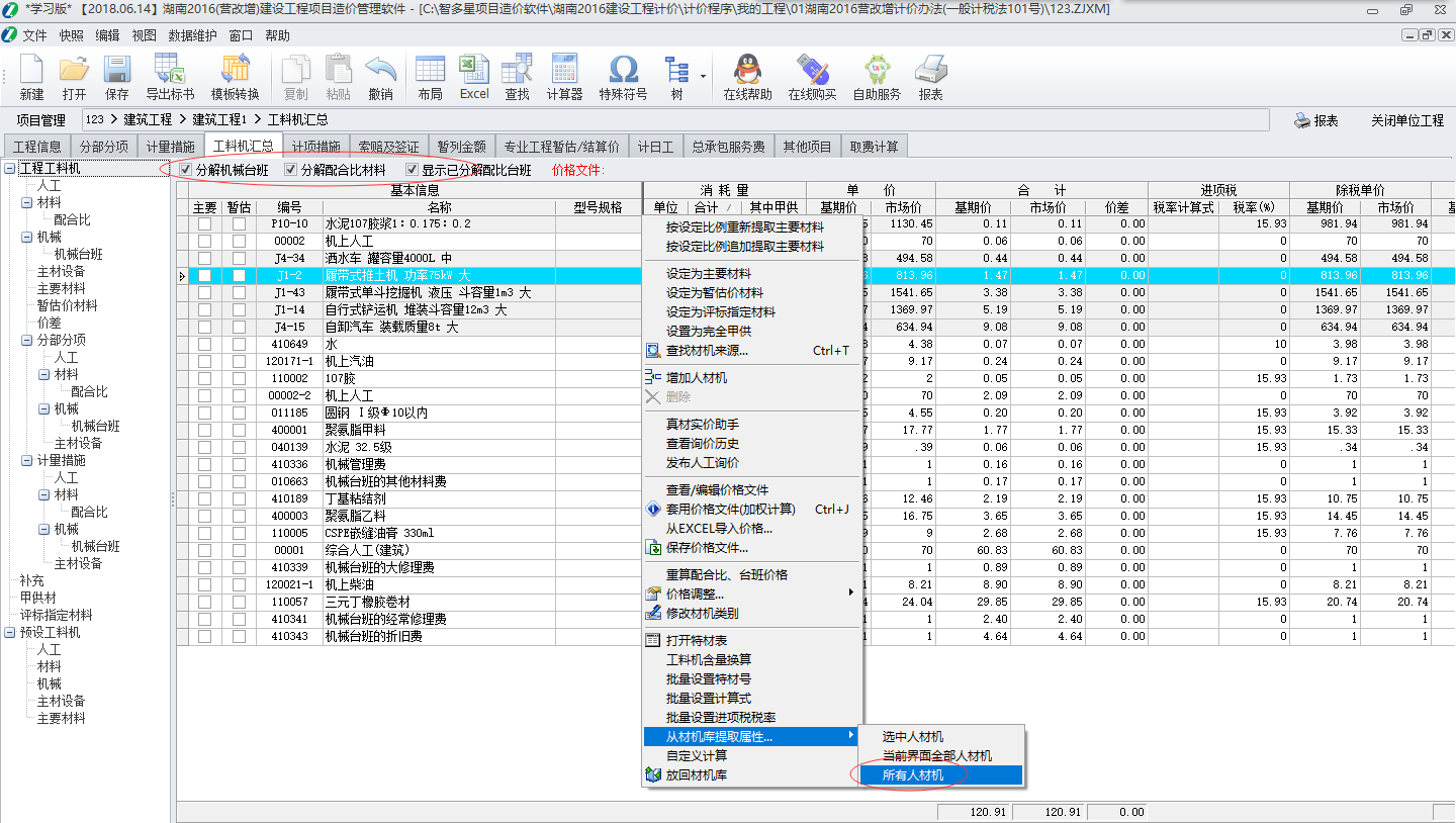 2.進到【工料機匯總】界面, 重新提取下材機(主要是進項稅稅率): 任意點擊一行,點右鍵-從材機庫提取屬性-所有人材機,這樣提取即可。