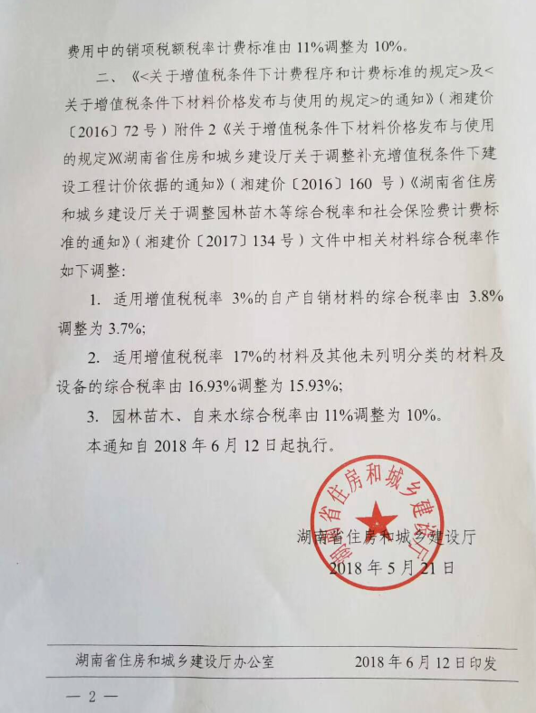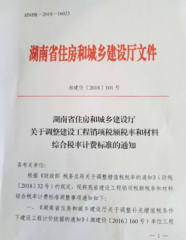 關于湘建價〔2018〕101號調整建設工程銷項稅額稅率和材料,綜合稅率計費標準調整如下: