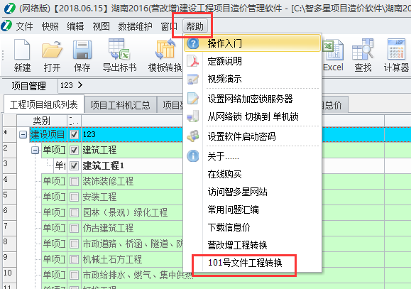 1、首先,打開(kāi)16版計(jì)價(jià)軟件后點(diǎn)擊工具欄幫助下的101文件轉(zhuǎn)換。