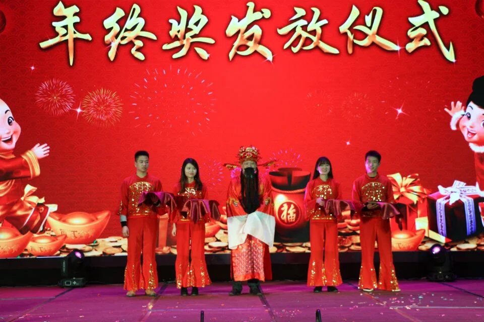 接下來,最期待、最歡快的環(huán)節(jié)來了——年終獎發(fā)放儀式。何總裝扮成財神爺?shù)哪樱瑤е膫€童子歡樂登場!