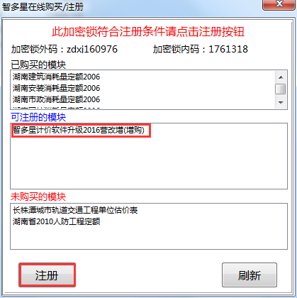 第三步:在彈出的窗口中,系統會自動檢測該加密鎖是否符合自助升級的條件,如符合條件,系統會將可注冊升級的模塊全部羅列展示出來: