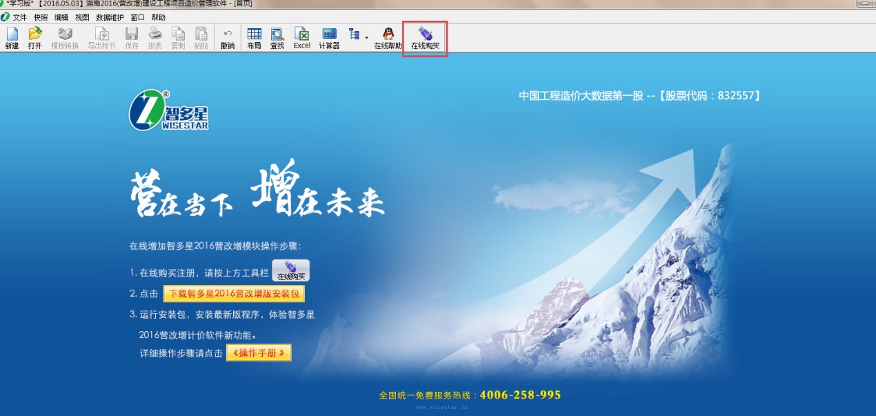 湖南“2016營改增”計價辦法已于2016年5月1日起正式執行,智多星也已第一時間將包含“營改增計價辦法”的軟件程序公布在智多星官網,供用戶下載。由于此次升級量巨大,為節省您的時間和精力,我們推薦您優先使用“網上在線自助升級”功能,通過銀聯或支付寶付款,一鍵購買、注冊,安全便捷。具體操作請參照一下步驟:
