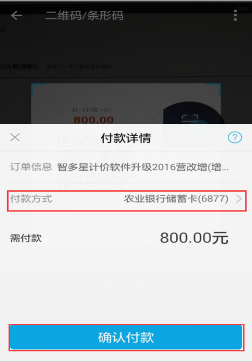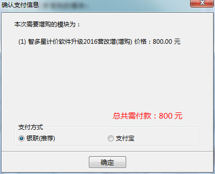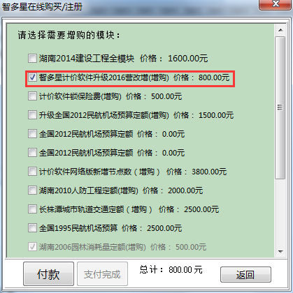 第四步:勾選‘智多星計價軟件升級2016營改增(增購)’,或任意一項您需要購買的模塊,之后點擊“付款”按鈕。