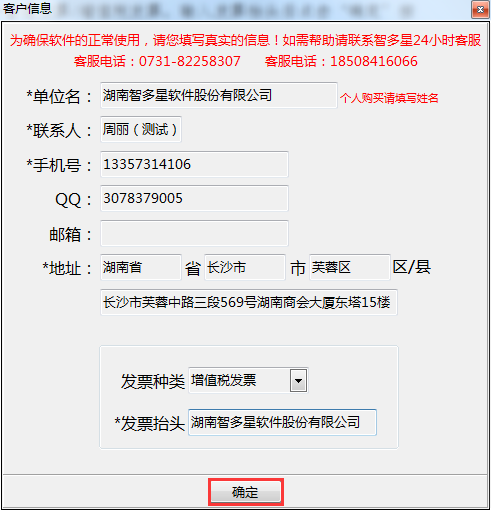 第五步:系統會自動彈出該加密鎖之前收錄的客戶信息,如信息不正確,請務必將您的正確信息進行修改后提交,以免給您的軟件升級帶來不必要的煩惱;如需開具發票,請在開票處打勾,選擇需要開票的類型—普通發票/增值稅發票,輸入發票抬頭后點擊‘確定’按鈕: